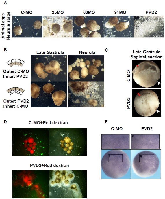 Figure S2 (Refers to Figure 2). Adhesion Phenotypes in POUV depleted embryos. (A) The three Xenopus PouV proteins have distinct cell adhesion phenotypes. Animal caps from embryos injected with single MO were dissected at stage 8 and cultured until stage 14 (neurula). Xlpou25 explants exhibited a partial loss of adhesion but PVD2 displayed the most severe adhesion phenotype. (B) Adhesion phenotypes are dependent on the superficial layer of the ectoderm. Animal caps superficial (outer) and inner layer were separated in Calcium-Magnesium free medium (CMFM). Individual layers from control and PVD2 morphant explants were then recombined. PVD2 outer layers were unable to surround the control inner layer cells and completely lost adhesion by neurula stage. However, wild-type outer layers could rescue disaggregation of morphant inner layers (C) POUV depleted embryos displayed defective animal cap epiboly. Ectoderm in PVD2 embryos did not become thinner as in controls (red mark), but appeared as a thick multilayer of densely packed cells. Blastocoel cavity also collapsed in PVD2 embryos (black dotted outline). Photograph showing sagittal section of mid-gastrula embryos, dorsal blastopore lip on the right (white arrow). (D-E) POUV depletion does not increase cell death in animal cap explants or whole-embryos during gastrulation. (D) Animal caps were stained with Sytox-green to identify dead cells and photographed at stage 12.5. TexasRed fluorescent dextran was used as a marker for injection. PVD2 morphants showed the same number of dead cells (green) as the Control-MO. (E) Whole-mount TUNEL staining on stage 10.5 embryos revealed similar extent of cell death between Control-MO and PVD2, photographs showing animal view (ectoderm). Boxed inserts are shown at higher magnification. |