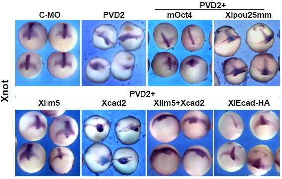Figure S4 (Refers to Figure 4). Rescue of Convergent Extension Defect in PVD2 Embryos. Embryos were injected with Control-MO or PVD2 (120ng) and 500pg mRNA of the indicated POUV protein or POUV target. Figure shows whole-mount in situ hybridisation for the notochord marker Xnot, dorsal view. See also Figure 4 for a close up of these embryos. |