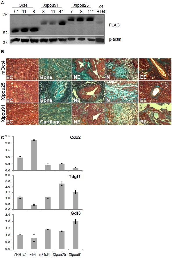 Figure S5 (Refers to Figure 5 and 6). POUV Rescued Mouse ESC Lines. (A) Clonal cell lines in which Oct4 was replaced by different FLAG tagged POUV proteins were generated from ZHBTc4 ES cells with FLAG--mOct4, -Xlpou25 and - Xlpou91. All tagged POUV proteins supported ESC self-renewal as previously described. Protein levels are shown by immunoblot. Equal amounts of total protein were loaded based on normalization to ï¢-actin. Three clonal cell lines for each POUV protein are shown in the figure. The experiments in Figure 5, 6 were done with clone 6 (Oct4) clone 11 (Xlpou25) and clone 4 (Xlpou91). These three lines were selected based on their expression of similar levels of the different POUV proteins. (B) ESCs supported by FLAG-POUV are pluripotent. Cells were transferred under the kidney capsule of adult 129/Ola mice. Mice were fed Tetracycline to ensure repression of the Tet-responsive Oct4 transgene contained in the ZHBTc4 parental line. After 4-5 weeks, tumors were sectioned and subjected to Masson�s trichrome staining. Tumors displayed examples of primitive tissues from all three embryonic germ layers. They contained embryonal carcinoma (EC) cells, neuroepithelium (NE), mature neural tissue (N), cartilage, bone, endodermal epithelium (EE), and pulmonary epithelium (PE). (C) FLAG-POUV supported ESCs express epiblast markers during ESC differentiation. Gene expression analysis by qRT-PCR of FLAG-POUV ESC cells following 4 days of differentiation towards mesoderm and endoderm. All three POUV proteins supported the expression of epiblast markers (Tdgf1, Gdf3) and antagonized Cdx2 induction in response to Tetracycline. Expression levels are normalized to TBP and shown as mean +/- SD. |