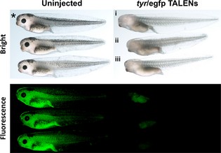 Figure 1. Phenotypes of the tyr/egfp transcription activator-like effector nuclease (TALEN)-injected embryos. Bright (upper) and fluorescence (lower) images show pigmentation and green fluorescent protein (GFP) fluorescence, respectively. Uninjected, uninjected embryos. tyr/egfp TALENs, embryos co-injected with each pair of TALEN mRNAs targeting tyr and egfp. Genomic DNA of the uninjected (an asterisk) and the TALEN-injected (i, ii, and iii) embryos were subjected to heteroduplex mobility assay (HMA), restriction fragment length polymorphism (RFLP) analysis, and DNA sequencing (see Fig. 3).