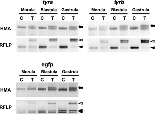 Figure 4. Timing of introduction of mutations after transcription activator-like effector nucleases (TALENs) mRNA injection. TALEN-mediated mutations in tyra, tyrb, and egfp at the early stages of embryogenesis were detected by heteroduplex mobility assay (HMA) (upper) and restriction fragment length polymorphism (RFLP) analysis (lower). Genomic DNA was extracted from 5 to 10 embryos at the stages indicated at the top of the gel electrophoresis images. Arrows, open and closed arrowheads are described in Figure 3A. C and T indicate the uninjected embryos and the TALEN-injected embryos, respectively.