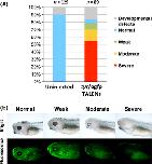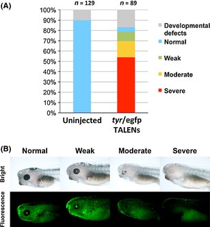 Figure 2. Phenotype frequency and toxicity of the tyr/egfp transcription activator-like effector nuclease (TALEN)-injected embryos. (A) Percentage of phenotypes in the uninjected embryos (Uninjected) and the tyr/egfp TALEN-injected embryos (tyr/egfp TALENs). Except for abnormally developed embryos, phenotypes were divided into four groups (severe, moderate, weak, and normal) according to the extent of loss of pigments in the RPE. Total numbers of individuals are shown at the top of each graph. (B) Correlation between albinism and loss of green fluorescent protein (GFP) fluorescence in the TALEN-injected embryos. Corresponding images in each embryo show phenotypes of pigmentation (severe, moderate, weak, and normal; upper images) and GFP fluorescence (lower images).