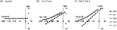 Fig. 2. TdHKT1;4-1 and TdHKT1;4-2 function as monovalent cation transporters with a strong preference for Na+ in Xenopus oocytes. Bath solutions contained the standard background supplemented with NaCl, KCl, RbCl, CsCl, or LiCl, at 3mM. The voltage-clamp protocol consisted of 12 pulses of 1 s, with a voltage increment of 15 mV between pulses. (A) Currents from control (H2O-injected) oocytes plotted against applied voltages. (B, C) Currents flowing through TdHKT1;4-1 (B) and TdHKT1;4-2 (C) transporters versus applied voltages. Data are means±standard error (SE) (n=4) and are representative of five experiments performed on different oocyte batches.
