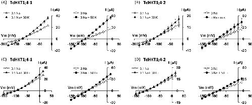 Fig. 4. Effect of external K+ and Li+ on Na+ transport by TdHKT1;4-1 (A, C) and TdHKT1;4-2 (B, D). Bath solutions contained 0.1mM (left panels) or 3mM (right panels) Na+ (glutamate salts). They were or were not supplemented with KCl (A, B) or LiCl (C, D), with concentration of the added salt being 30mM (left panels) or 50mM (right panels). Data are means±SE (n=7 in A, n= 6 in B, n= 5 in C, n=8 in D) and are representative of two experiments performed on different oocyte batches.