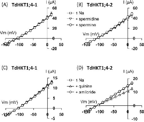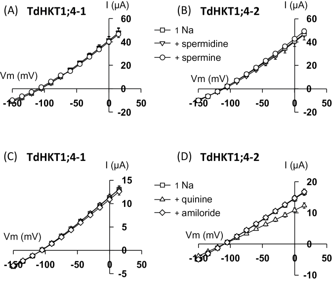 Fig. 5. Effect of potential inhibitors on Na+ transport activity in TdHKT1;4-1 (A, C) and TdHKT1;4-2 (B, D). Control (1 Na) external solution contained 1mM Na+ as glutamate salt. Currents were recorded successively in the control solution and in the same solution but supplemented with 1mM spermine or 1mM spermidine (A, B) or with 500 µM amiloride or 500 µM quinine (C, D). Data are means±SE (n=7 in A, n=3 in B, n=5 in C and D).