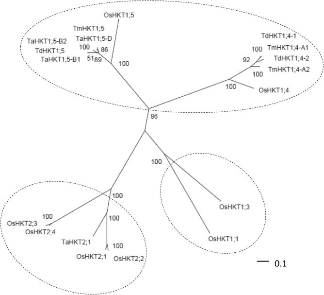 Fig. 1. Phylogenetic relationships between HKT transporters in rice and wheat. The unrooted phylogenetic tree was constructed using full polypeptide sequences aligned with MUSCLE (http://www.bioinformatics.nl/tools/muscle.html; Dereeper et al., 2008), and the neighbour-joining method with 1000 bootstrap replicates, using PhyML software (http://phylogeny.lirmm.fr). The tree was drawn using Dendroscope (Huson et al., 2007). Bootstrap values (as percentages) are indicated at the corresponding nodes. The protein accession numbers are: OsHKT1;1, Q7XPF8.2; OsHKT1;3, Q6H501.1; OsHKT1;4, Q7XPF7.2; OsHKT1;5, Q0JNB6.1; OsHKT2;1, Q0D9S3.1; OsHKT2;2, BAB61791.1; OsHKT2;3, Q8L481.1; OsHKT2;4, Q8L4K5.1; TaHKT1;5-B1, ABG33943; TaHKT1;5-B2, ABG33944; TaHKT1;5-D, ABG33945; TaHKT2;1, AAA52749; TmHKT1;4-A1, ABK41858; TmHKT1;4-A2, ABK41857; TmHKT1;5, ABG33939; TdHKT1;4-1, KF443078; TdHKT1;4-2, KF443079. Os, Oryza sativa; Ta, Triticum aestivum; Td, Triticum turgidum subsp. durum; Tm, Triticum monococcum.