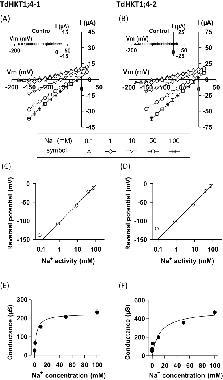 Fig. 3. TdHKT1;4-1 and TdHKT1;4-2 transporters differ in their affinity for Na+. (A, B) Currents flowing through TdHKT1;4-1 (A) or TdHKT1;4-2 (B) transporters versus applied voltages in the presence of varying external Na+ concentrations (0.1, 1, 10, 50, and 100mM). Na+ was provided as glutamate salt. Data are means±SE (n=4 in A and n=5 in B) and are representative of six experiments performed on different oocyte batches. Insets in (A) and (B): I–V relationships in water-injected oocytes belonging to the same batch as HKT-expressing oocytes. Experimental conditions were the same as for HKT-expressing oocytes. Currents are means±SE (n=4 in A and n=3 in B). (C, D) Zero-current potentials through TdHKT1;4-1 (C) and TdHKT1;4-2 (D) versus bath Na+ activity. Current reversal potentials were obtained from the I–V data shown in (A) and (B). (E, F) Variation of TdHKT1;4-1 (E) and TdHKT1;4-2 (F) macroscopic inward conductance with external Na+ concentration. Macroscopic inward conductances were defined as slopes of I–V relationships between the three most negative imposed potentials in each ionic condition. The conductances in (E) and (F) were extracted from the I–V data shown in (A) and (B). Inward conductances plotted against external Na+ concentrations were fitted (solid line) with a Michaelis–Menten equation to determine the apparent half-saturation constant (K