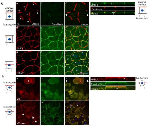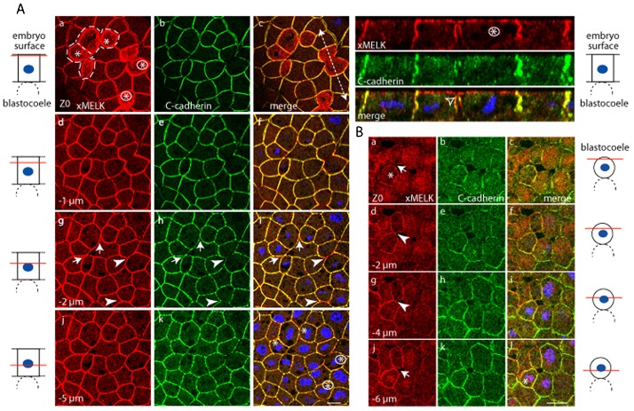 Fig. 1. Comparative analysis of xMELK localization in epithelial and mesenchyme-like cells in blastula embryos.Indirect immunofluorescence with anti-xMELK (red) and anti-C-cadherin (green) antibodies was performed on fixed Xenopus albino embryos at blastula stage. (A) Epithelial cells corresponding to the embryonic external cell layer were analyzed by confocal microscopy; 3 optical sections are shown. (B) Internal mesenchyme-like cells facing the blastocoel were observed after dissection of fixed embryos; 2 optical sections are shown. Arrows point to xMELK accumulated at cell–cell contacts. Diagrams on the left: red lines mark the confocal planes relative to embryo surface and blastocoel. Images were merged to visualize co-localization of xMELK with C-cadherin (merge, panels Ac,f,i and Bc,f), DNA is shown (blue). Asterisks indicate cytokinetic cells. White dashed arrows in panels Ac and Bc symbolize the planes used for orthogonal projections of confocal planes shown on the right. Scale bars: 100 µm.