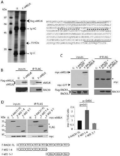 Fig. 6. xMELK and RACK1 are in the same complex.(A) Identification of RACK1 as a potential xMELK partner. Proteins extracted from FLAG-xMELK expressing or uninjected control (U.) embryos were immunoprecipitated with anti-FLAG antibodies, separated by SDS-PAGE and silver stained. The 35 kDa band present in the FLAG-xMELK but not in the control immunoprecipitate was cut out from the gel and analyzed by mass spectrometry. Two peptides matching RACK1 protein sequence (underlined) were identified. Two additional peptides were identified in an independent experiment (dashed underline). Ig HC and Ig LC: immunoglobulins heavy and light chains, respectively. (B,C) Validation of xMELK and RACK1 interaction. (B) Proteins were extracted from FLAG-xMELK (F-MELK) expressing or uninjected (U.) embryos (inputs). Proteins were immunoprecipitated with anti-FLAG antibodies (IP FLAG) and Western blots were incubated with anti-xMELK and anti-RACK1 antibodies. (C) Protein extracts (inputs) were prepared from embryos co-expressing FLAG-RACK1 (F-RACK1) and myc-GFP (m-GFP), FLAG-RACK1 and myc-xMELK (m-MELK) or uninjected control embryos. Proteins were immunoprecipitated with anti-FLAG antibodies (IP FLAG) and Western blots were incubated with anti-myc and anti-RACK1 antibodies. (D) xMELK preferentially associates with RACK1 N-terminal domain. Protein extracts (inputs) were prepared from embryos co-expressing myc-xMELK with full length FLAG-RACK1 (F-RACK1 FL), FLAG-RACK1 WD1–4 (F-WD1–4), and FLAG-RACK1 WD5–7 (F-WD5–7) or uninjected (U.) embryos. Proteins were immunoprecipitated with anti-Flag antibodies (IP FLAG) and Western blots were incubated with anti-FLAG and anti-myc antibodies. The histogram on the right represents quantifications of the myc signal obtained in 3 independent immunoprecipitation experiments normalized with the corresponding FLAG signals (myc/FLAG ratio). Error bars denote s.e.m., a t-test was performed and p values are indicated above bars. Schematic representation of the RACK1 constructs is shown. The grey box indicates the FLAG tag.