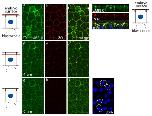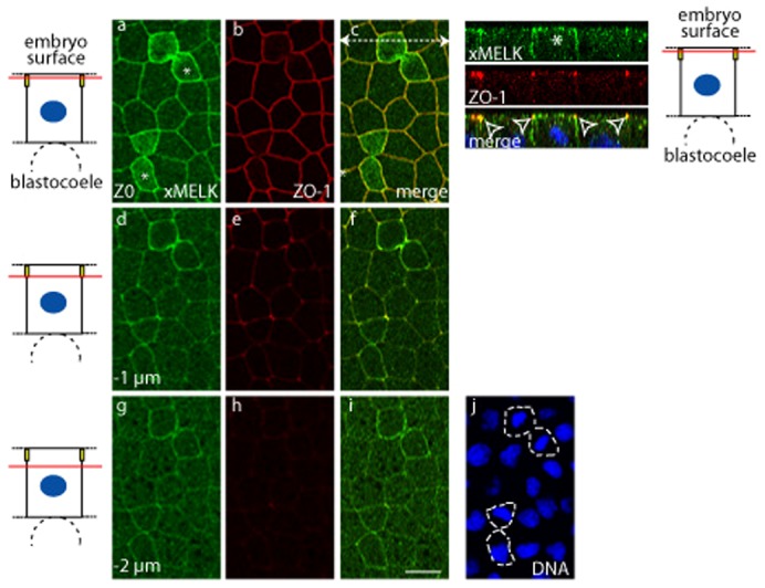 Fig. 3. In epithelial cells xMELK accumulates at the tight junctions.Confocal microscopy of indirect immunofluorescence with anti-xMELK (green) and anti-ZO-1 (red) antibodies of epithelial cells from fixed albino embryos at gastrula stage. Three single optical sections spaced by 1 µm are shown. Asterisks indicate cytokinetic cells. Diagrams on the left: red lines mark the confocal planes relative to embryo surface and yellow rectangles symbolize tight junctions. Images were merged to visualize co-localization of xMELK with ZO-1 (merge, c,f,i). DNA is blue (j), dividing cells are indicated by dashed lines. White dashed arrow in panel c symbolizes the plane used for orthogonal projection of confocal planes shown on the right. Arrowheads point to the xMELK which co-localizes with ZO-1 at the tight junctions. Scale bar: 20 µm.