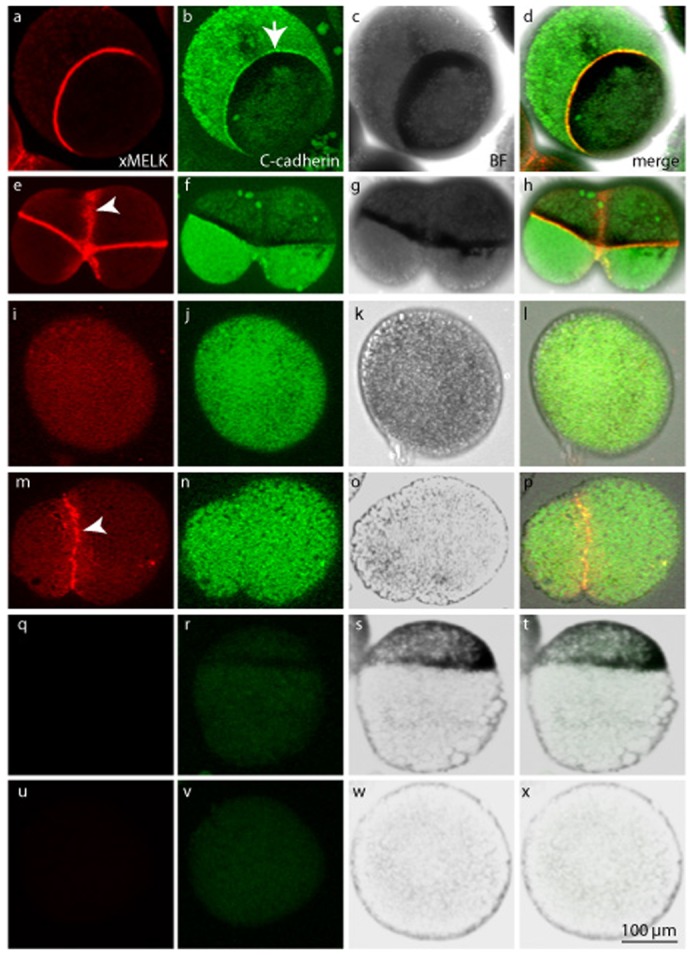 Fig. 4. xMELK localization in interphase and dividing cells of dissociated blastula embryos.Pigmented embryos were dissociated by incubation in calcium and magnesium devoid medium. Isolated cells were fixed and immunofluorescence was performed with anti-xMELK (red, a,e,i,m) and anti-C-cadherin (green, b,f,j,n) antibodies. Control cells (q–x) were processed for indirect immunofluorescence like others except that the primary antibody was omitted. Bright field microscopy (BF, grey, c,g,k,o,s,w) shows pigmented epithelial cells (a–h,q–t) and mesenchyme-like cells devoid of pigments (i–p,u–x). Images were obtained by projection of 10 single confocal sections. Images were merged to visualize co-localization of xMELK with C-cadherin (merge, d,h,l,p,t,x). Interphase (a–d,i–l,q–x) and dividing (e–h,m–p) cells are shown. Scale bar: 100 µm.
