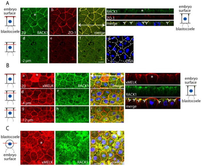 Fig. 7. In epithelial cells, RACK1 co-localizes with xMELK at the tight junctions.(A) In gastrula epithelial cells, RACK1 co-localizes with ZO-1 at the tight junctions. Endogenous RACK1 (green, a,d) and ZO-1 (red, b,e) were detected with specific antibodies. Two single optical sections spaced by 2 µm are shown; their positions relative to the embryo surface are symbolized by red lines (diagrams on the left). Yellow rectangles symbolize tight junctions. Images were merged to visualize co-localization of RACK1 with ZO-1 (merge, c,f). DNA is blue (g). Asterisks indicate cytokinetic cell. White dashed arrow in panel c indicates the plane used for orthogonal projection of confocal planes shown on the right. Arrowheads point to the RACK1 which co-localizes with ZO-1 at the tight junctions. (B) RACK1 colocalizes with xMELK at the tight junctions. In epithelial cells, xMELK (green, a,d,g) and RACK1 (red, b,e,h) detected by specific antibodies co-localize at the tight junctions. Diagrams on the left: confocal planes relative to embryo surface are marked by red lines. Yellow rectangles symbolize tight junctions. The asterisk indicates cytokinetic cell. Orthogonal projections of confocal planes are shown on the right. The plane of orthogonal projection is indicated by a white dashed line in panel c. Arrowheads point to the RACK1 which co-localizes with xMELK at the tight junctions. (C) xMELK (red) and RACK1 (green) were detected by indirect immunofluorescence with specific antibodies in mesenchymal-like cells. Confocal plane relative to the blastocoel is indicated by a red line on the diagram on the left. Asterisk indicates cytokinetic cell. Images were merged together with images of DNA (blue) at the same confocal planes to visualize co-localization of xMELK with RACK1 (merge). Scale bars: 20 µm.