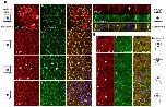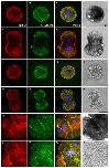 Fig. 5. Two xMELK subpopulations have distinct requirement for cell–cell contacts for their localization at the cell cortex.Animal caps of pigmented embryos were dissected and cells were dissociated with trypsin treatment. Cells were left isolated (a–p) or sorted according to their pigmentation and allowed to re-associate for 3 hours (q–x). Cells were fixed, processed for indirect immunofluorescence with anti-xMELK (red) anti-C-cadherin (green) antibodies and observed by confocal microscopy. Single optical sections are shown. Bright field (BF, grey) show pigmented epithelial cells (a–h,q–t) and mesenchyme-like cells devoid of pigment (i–p,u–x). Images were merged together with images of DNA (blue) at the same confocal plane to visualize co-localization of xMELK with C-cadherin (merge, c,g,k,o,s,w). Scale bars: 20 µm.