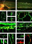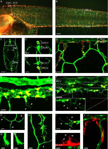 (A,B) Specific �LEC labeling� of lymph vessels (orange) by TRITC-dextran 24 hours after angiography of stage 46 tadpoles, allowing prolonged visualization of the vessels in the lymph heart (asterisk) area (A) and tail (B). (C�C″) Confocal imaging of cross sections of a LEC labeled tadpole confirmed exclusive labeling of lymphatics (DCLV, VCLV), while blood vessels (PCV, DA) remain green. C′�C″ are higher magnifications of the dorsal (C′) and ventral (C″) frames in panel C. (D) High magnification of vascular sprouting into the fin showed distinct morphology between smooth blood vessels (green) and the spiky lymphatics (red/orange). (E,F) Blood vessel (PCV, green) and lymph vessel (VCLV, yellow/organge) in close proximity. LECs of the VCLV exhibit small protrusions and filopodia (arrowheads). (G�G″) Newly forming blood vessel sprouts display a typical tip cell phenotype (arrowheads) with several filopodia. G′�G″ are higher magnifications of angiogenic tip cells. (H) Lymphatic tip cell with protruding filopodia (arrowhead). (I,I′) High magnification of lymphatic tip cells with filopodia (arrowheads) at the forefront of a lymph vessel in the fin (I) or of a new sprout forming from the DCLV (I′). (J) Lymphatics (red) occasionally sprouted at the same site as blood vessels (green), seemingly using them as a scaffold for further elongation into the fin. CLD, cephalic lymph duct; DA, dorsal aorta; DCLV, dorsal caudal lymph vessel; LLD, lateral lymph duct; NC, notochord; PCV, posterior cardinal vein; VCLV, ventral caudal lymph vessel. Scale bars: 200 �m (A,B), 100 �m (C), 50 �m (C′,C″,D,G), 20 �m (E,F,H,I′,J), 10 �m (G′,G″,I).