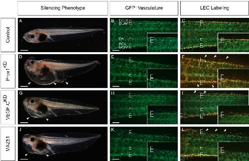 All panels depict lateral views of stage 45 tadpoles, head facing left. All insets show higher magnification of the dorsal side, with top and lower bracket denoting DCLV and DLAV, respectively. (A�C) Control embryo showing normal morphology (A) and correctly formed GFP+ (B) and LEC labeled lymphatics (C). (D�F) Morpholino knockdown (KD) of xProx1 resulted in edema around heart, gut and cloaca (arrowheads in panel D). GFP fluorescent microscopy showing that Prox1KD tadpoles possess few and disorganized LECs failing to assemble into the dorsal and ventral lymphatics (E). LEC labeling showing fewer LECs in xProx1KD tadpoles. Arrowheads denote sites where longitudinal lymph vessels are missing or malformed (green: DLAV, orange: DCLV) (F). (G�I) Morpholino knockdown (KD) of xVEGF-C resulted in edema in the heart and gut (arrowheads in panel G). Reporter VEGF-CKD tadpoles revealing a fragmented DCLV consisting of dispersed and scattered LECs on the dorsal side while the VCLV appears grossly normal as shown by fluorescent microscopy (H) and LEC labeling (I). Arrowheads denote sites where longitudinal lymph vessel is missing. (J�L) Chemical inhibition of VEGFR-3 by MAZ51 treatment (10 �M) resulted in edema in the heart and gut (arrowheads in panel J). Fluorescent microscopy (K) and LEC labeling (L) revealing a disorganized and fragmented DCLV consisting of few LECs, while the VCLV appeared normal. Arrowheads denote where longitudinal lymph vessels are missing. DA, dorsal aorta; DCLV, dorsal caudal lymph vessel; DLAV, dorsal longitudinal anastomosing vessel; PCV, posterior cardinal vein; VCLV, ventral caudal lymph vessel. Scale bars: 1 mm (A,D,G,J), 250 �m (B,E,H,K).