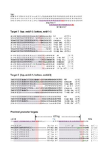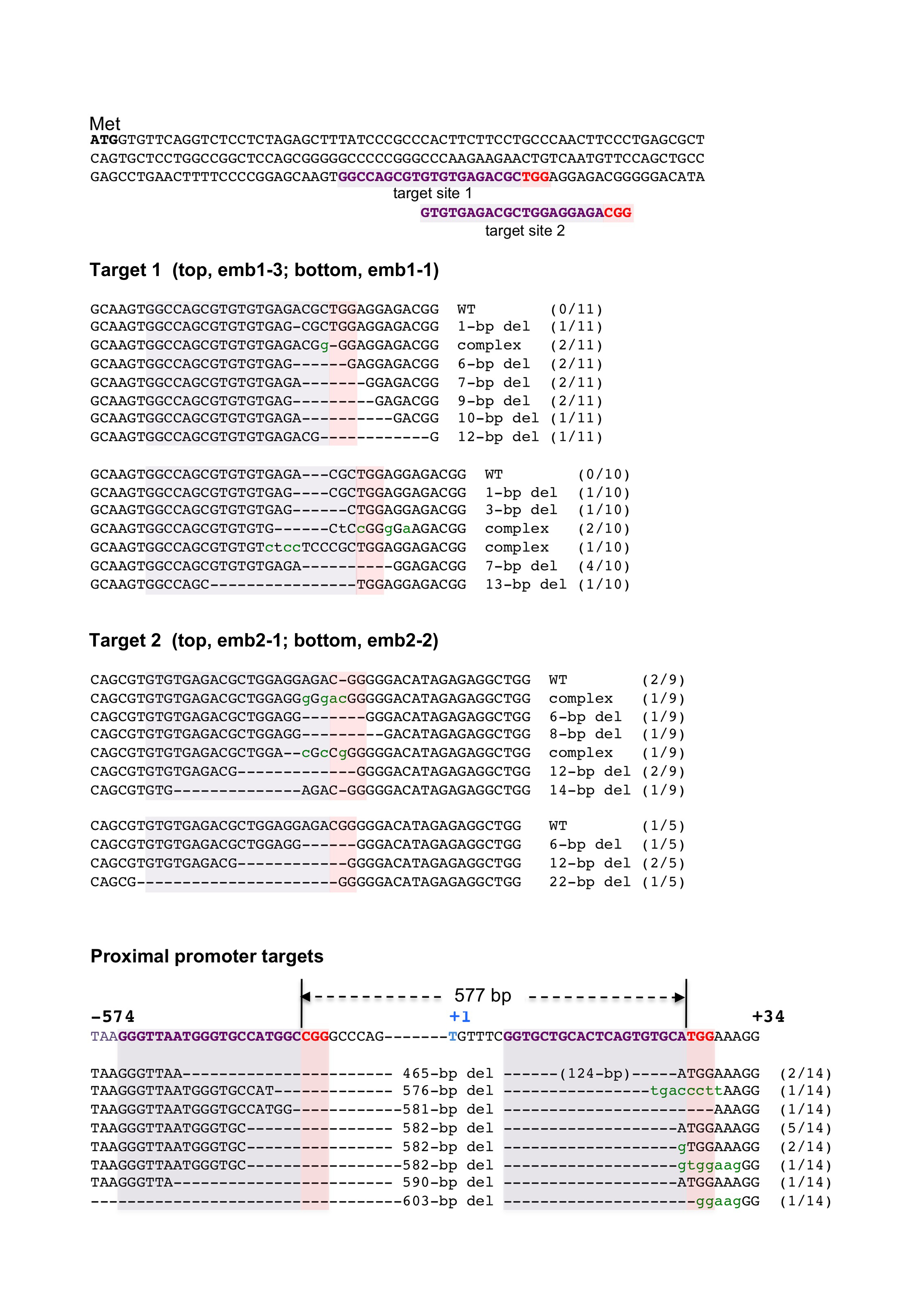 Supporting Information Fig. S1. Mutation profiles of the six3 gene found in individual embryos injected with sgRNAs targeting different regions. Top sequence shows the positions of target- 1 and 2 relative to the translation initiation codon (ATG, marked as Met) to cause frame-shifts. Note that target sites are partially overlapping. �Target 1� lists representative mutated sequences after recloning from two embryos (emb1-1 and emb1-3, see also Fig. 4f, six3 target 1) injected with sgRNA for target site 1. Eleven clones from one embryo (emb1-3) and ten clones from a second embryo (emb1-1) were analyzed. Note that no wild-type sequence (WT) was recovered. �Target 2� shows representative mutated sequences from two embryos (emb2-1 and emb2-2, see also Fig. 4f, six3 target 2) injected with sgRNA to target site 2. Nine clones from one embryo (emb2-1) and five clones from a second embryo (emb2-2) were analyzed. Note that WT sequence was recovered though at a relatively low frequency. �Proximal promoter targets� shows the -574 to +34 region with two sgRNA target sites and representative mutated sequences after recloning (14 clones) from an injected embryo (emb3, see also Fig. 4e). +1 is a tentative transcriptional start site according to the 5' end of an EST clone (accession number: DC185735). Target sequences and corresponding PAM regions are shaded in purple and red, respectively. The alignment is shown as described in Fig. 2b. |
