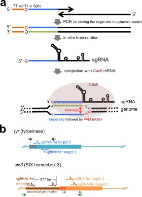 Figure 1. Strategy for CRISPR/Cas-mediated genome modification. (a) Schematic representation of experimental procedure. We found that the conventional plasmid subcloning method for making sgRNA templates was time-consuming and inconvenient; instead all sgRNAs used in this study are transcribed in vitro from double-stranded DNA templates that were made by PCR (except the sgRNA for tyr target site 1, which used a cloned template, pDR274-Xt-tyr). This PCR strategy uses a 5′ oligonucleotide (primer) that begins with the T7 promoter (shown as an orange line in this schematic; alternatively, T3 or SP6 promoters could be used) and contains the genomic target sequence (shown as a blue line in this schematic; note the genomic target sequence must begin with a G for proper transcriptional initiation using the T7 promoter) and a 3′ oligonucleotide (primer) that partly overlaps the 5′ primer and contains the sgRNA backbone sequence required for proper folding of sgRNAs. This rapid, easy way to make sgRNA templates by PCR takes less than two days to produce sgRNAs to inject once oligonucleotides are received. During the preparation of this manuscript, we have noticed that similar strategies have also been reported [e.g., (Bassett et al., 2013)] and thus this method has general versatility. The resulting sgRNAs were coinjected with Cas9 mRNA into one cell-stage Xenopus embryos. The bottom part of the scheme shows how sgRNA and Cas9 work to cleave the target site in the genome. Briefly, the sgRNA forms a complex with the Cas9 protein and identifies the target site via complementary base-pairing. The Cas9 nuclease subsequently cleaves the genomic DNA at the target site, just upstream of the PAM sequence. (b) Targeting strategy for the two genes described in this study. Both tyr and six3 genes were targeted in exon 1 to cause frame-shifts after the translation initiation codon (ATG). Two independent sgRNAs were tested for both genes. The six3 gene was furthermore targeted in the proximal promoter region with two sgRNAs simultaneously to cause deletion of the promoter region. Bent arrows (blue for tyr, orange for six3 exons and brown for the six3 promoter) show sgRNA targets. Arrows (black for tyr, green and grey for six3) indicate genomic PCR primers for mutation analyses. Note that the 3' primer for the six3 gene is common for both sets of PCR reactions but colored differently for clarity. Drawings are not to scale. |
