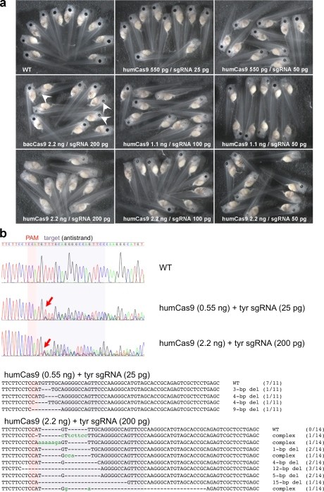 Figure 2. Successful targeting of the tyrosinase gene caused albinism in Xenopus embryos. (a) Different dose combinations of Cas9 mRNA and sgRNA were tested. The severity of the phenotype was directly dependent on the amounts of RNAs injected. bacCas9, the original bacterial-codon Cas9 mRNA (which shows examples with a weak phenotype; a patchy loss of pigmentation in the RPE is indicated by white arrowheads). humCas9, the modified Cas9 using humanized-codons. sgRNA, targeting tyrosinase gene (first target, see Fig. 3b for location relative to ATG). The toxicity of sgRNA seems to vary depending on its sequence and also on the batch of embryos. For example, in one specific experiment, tyrosinase sgRNA (target1) was overall relatively nontoxic, with more than 75% of injected embryos developing normally one day after injection at all tested doses shown here (76.9�97% survivors [n=19�33] as opposed to 84.8% of uninjected embryos [n=46]), whereas in other experiments, survival was between 50�60% (see Supporting Information Table 1). (b) Representative results of conventional sequencing assays (top three panels). Each single embryo injected with indicated RNAs was lysed and the targeted genomic region was PCR-amplified; amplicons were then directly sequenced (DSP assay, see the text). Perturbation of peaks on the 3' side of the PAM region (red arrows) suggests in-del events happen in-between the target sequence (shaded in purple) and the PAM region (shaded in red). PCR amplicons were recloned and sequenced to show the profile of individual mutations found in mosaic individuals (bottom sequence alignments). Dashes (-) indicate gaps. Lowercase green characters indicate insertions or substitutions. The numbers in parentheses indicate the frequency of each mutation pattern seen in total numbers of sequenced clones. |