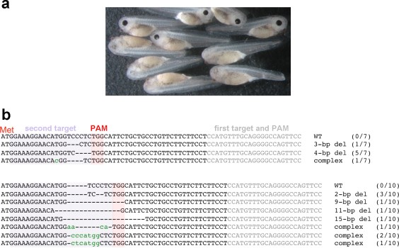 Figure 3. The mutation of a second tyr gene target site also caused albinism. (a) Phenotype of injected embryos (bottom five embryos; top five embryos are uninjected sibling controls) with Cas9 mRNA (2.2 ng) and sgRNA (200 pg) for the second target site. (b) Representative mutation profiles from two embryos sequenced after cloning. The second target sequence (shaded in purple) and the PAM sequence (in red) are shown together with first target and PAM sequences (in gray; see Fig. 2) relative to the ATG (Met) site. The alignment shown is labeled as described in Fig. 2b |