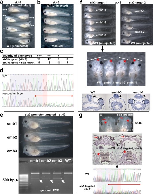 Figure 4. Summary of phenotype caused by mutations of six3 gene. All targeted mutations showed a similar phenotype. (a-d) Phenotype variations seen in st.40 embryos targeted with the sgRNA for coding region site 1. By this stage, the obvious phenotype is significantly reduced eye size, but a brain defect (see below) is not yet obvious. The phenotype is six3-specific because it was partially rescued by coinjection of six3 mRNA (b, c). Severity of phenotype was scored as +++ (most severe, no eye or tiny piece of eye), ++ (severe, small and malformed eye),â+â(modest, small relatively normal looking eye), and - (no or little phenotype) (a�c). As observed with the tyr target injections, toxicity of injected RNAs varied greatly depending on batch of embryos. For example, in different experiments, the percentage of normal embryos recovered after the same RNA doses were injected (six3 target 1) varied from 43% to 87% (see Supporting Information Table S1). (d) Chromatograms of the DSP assay from an uninjected embryo (WT) and one of rescued embryos shown in (b). Perturbation of peaks is seen around the PAM region (two-headed red arrow), suggesting the presence of mutated sequences. At later stages, the brain phenotype becomes obvious (e-g). (e) Examples of the phenotype of embryos (emb1 to emb3) targeted to delete the proximal promoter region at st.42. Using the primer as schematically shown in Fig. 1b (green arrows), genomic PCR of sibling uninjected wild-type embryo showed an expected â¼ 1.2 kbp band, whereas embryos injected with sgRNAs had an extra â¼ 0.6 kbp band (emb1-3, white arrows). One band (marked by *) was recloned and sequenced; the results are shown in Supporting Information Fig. S1. The promoter deletion injections were on average more toxic, perhaps due to higher total amounts of RNAs being injected, but survival rates as high as 68% were observed in individual experiments. (f) Phenotype examples of st. 42 embryos injected with sgRNA targeting coding region site 1 (left panel) and site 2 (right panel), lateral views. Compared to wild-type embryos (bottom, WT, round shaped head), mutant embryo heads had a more angular and flattened shape. The dorsal view (second panel) and frontal sections (third panel) of the same embryos (emb1-1, 1�2, 1�3) in first left panel clearly show narrow heads (compare two-headed white arrows between WT and mutants) and smaller brains (black arrowheads in frontal sections), especially the forebrain (red arrowheads in second panel, see also Fig. 4g) in the mutant embryos. The sequencing summary of mutated loci of emb1-1 and 1-3 in the top left panel and emb2-1, 2-2 in the top right panel are shown in Supporting Information Fig. S1. (g) A mild phenotype seen in embryos (target site 2) at st. 46. Top panel shows a dorsal view of embryos. Second panel shows horizontal sections of equivalent embryos shown in the top panel. At early stages, these embryos could be scored as wild type. Later observation of mutant embryos reveals that the nasal pits (red arrows) are fused (shown here) or shifted medially (not shown), and the telencephalon (red arrowheads) is smaller and fused. The last panel shows chromatograms of the DSP assay from one of the sectioned embryos shown above to confirm genomic mutations as evidenced by perturbation of peaks around PAM region (two-headed red arrow) in the mutant embryo. |