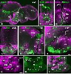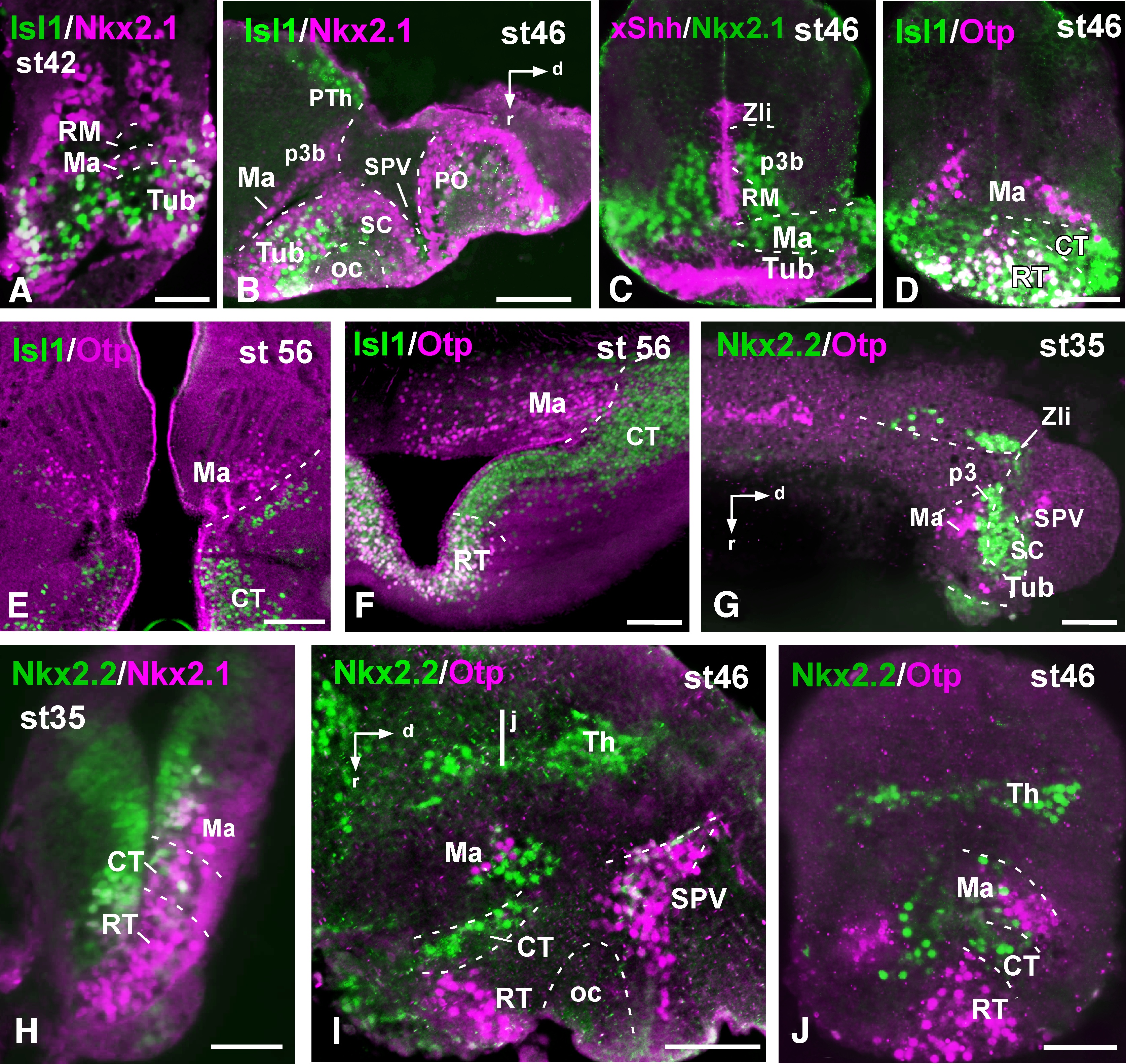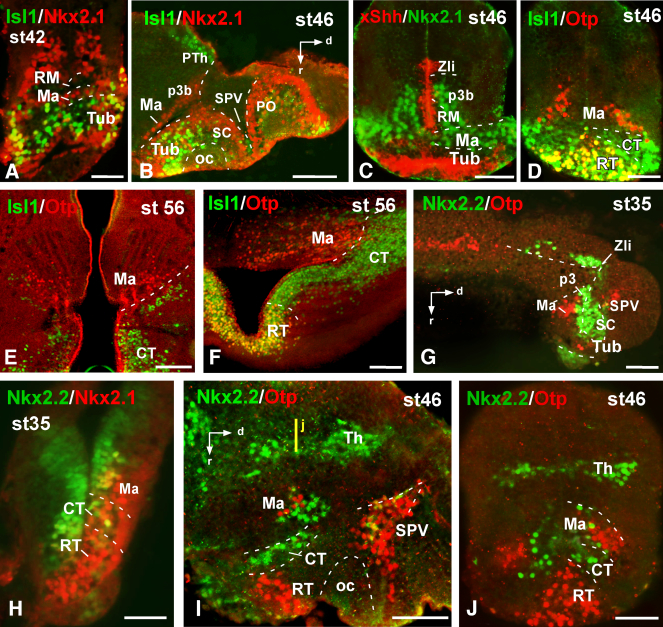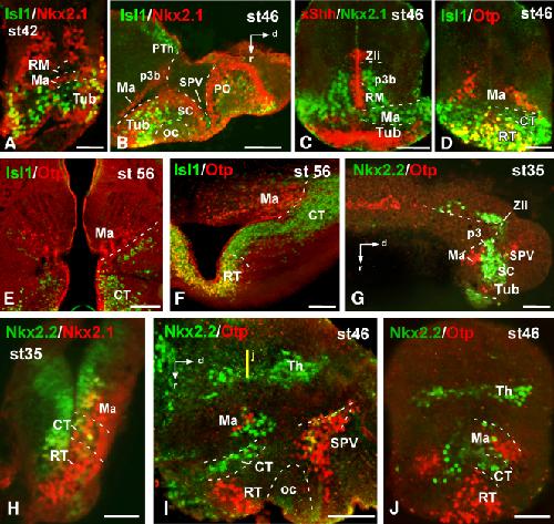 Supplementary Figure 3. Photomicrographs of transverse (A, C-F, H, J) and sagittal (B, G, I) sections through the developing hypothalamus of Xenopus showing in the mammillary region and adjacent areas the combined expression of Isl1 and Nkx2.1 (A,B), xShh and Nkx2.1 (C), Isl1 and Otp (D, E, F), Nkx2.2 and Otp (G I, J), Nkx2.2 and Nkx2.1 (H). The level of the transverse section shown in J is indicated by the vertical yellow line drawn in I. Developmental stages are indicated in each photograph. Scale bars: 100μm. This figure corresponds to the figure 4. |