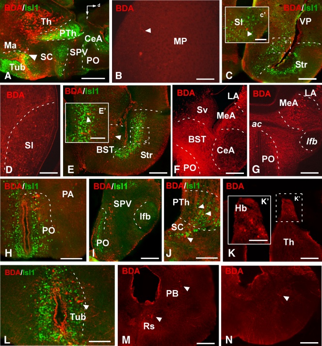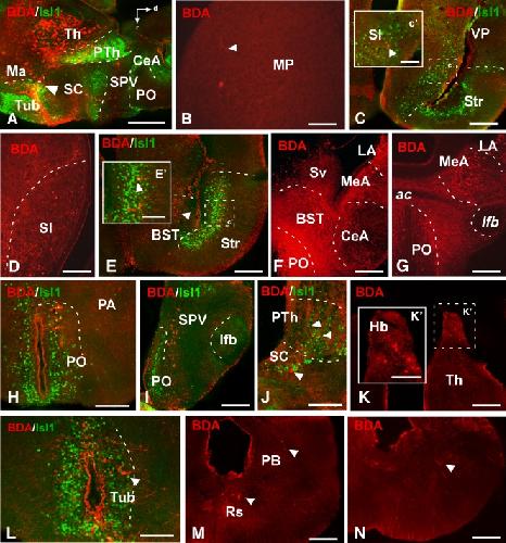 Figure 9. Photomicrographs of transverse sections showing the retrogradely labeled cells and anterogradely labeled fibers after BDA injection in the mammillar area of juvenile Xenopus, combined with the markers Isl1 (B-I) and Otp (D) to corroborate that the tracer was delivered into this particular area. The arrowheads in B–J indicate retrogradely labeled cells. A magenta-green version of this figure is provided as Supporting Information Fig. 7. Scale bars = 200 μm in G–I,J'; 100 μm in A–F,K. |