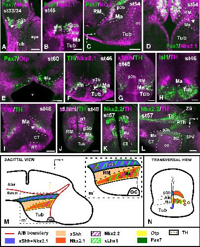 Figure 6. Photomicrographs of transverse (A,B,D–K) and sagittal (C,L) sections through the developing hypothalamus of Xenopus showing in the mammillary region and adjacent areas the combined expressions of Pax7 and Nkx2.1 (A,D) and Pax7 and Otp (E). The arrowheads in (A,D,E,F) show double-labeled cells. In addition, images are shown of the combined labeling for TH with Nkx2.1 (F), xShh (G), Isl1 (H), Otp (I), xLhx1 (J), and Nkx2.2 (K,L). The schematic representations at the bottom summarize the combinatorial codes of the markers in the mammillary hypothalamus in a lateral view of the brain and a transverse section. A magenta-green version of this figure is provided as Supporting Information Fig. 5. Scale bars = 100 μm in A,B,E–L (in E is valid for D); 50 μm in C |