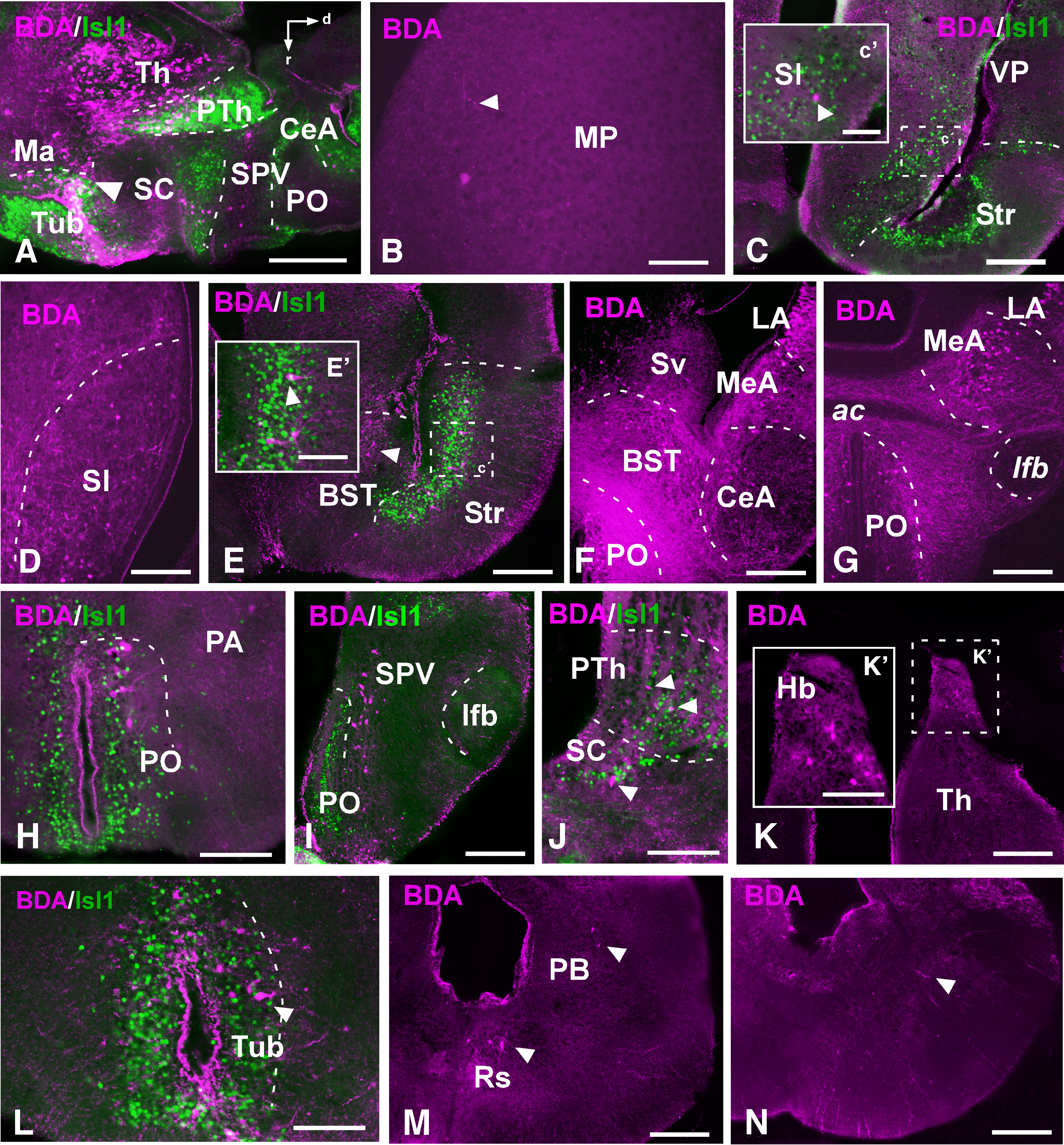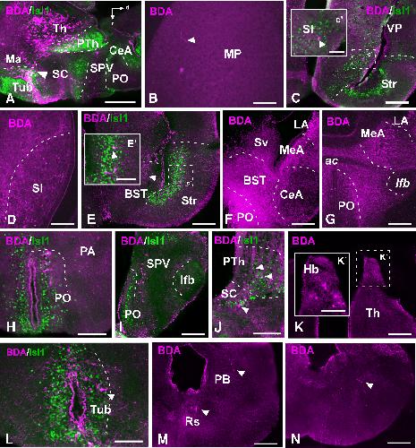 Figure 8. Photomicrographs of sagittal (A) and transverse (B–N) sections showing the retrogradely labeled cells and anterogradely labeled fibers after BDA injection in the Tub of juvenile Xenopus, combined with the marker Isl1 (A,C,E,H–J,L) to corroborate that the tracer was delivered into this paricular area. The dashed box in (C,E,K) indicate the higher magnification shown in (C',E',K'), respectively. The arrowheads in (A,B,C',E',J,M) and N point to retrogradely labeled cells or fibers. A magenta-green version of this figure is provided as Supporting Information Fig. 6. Scale bars = 500 μm in A; 100 μm in C–N; 50 μm in B,K'; 25 μm in C',E'. |