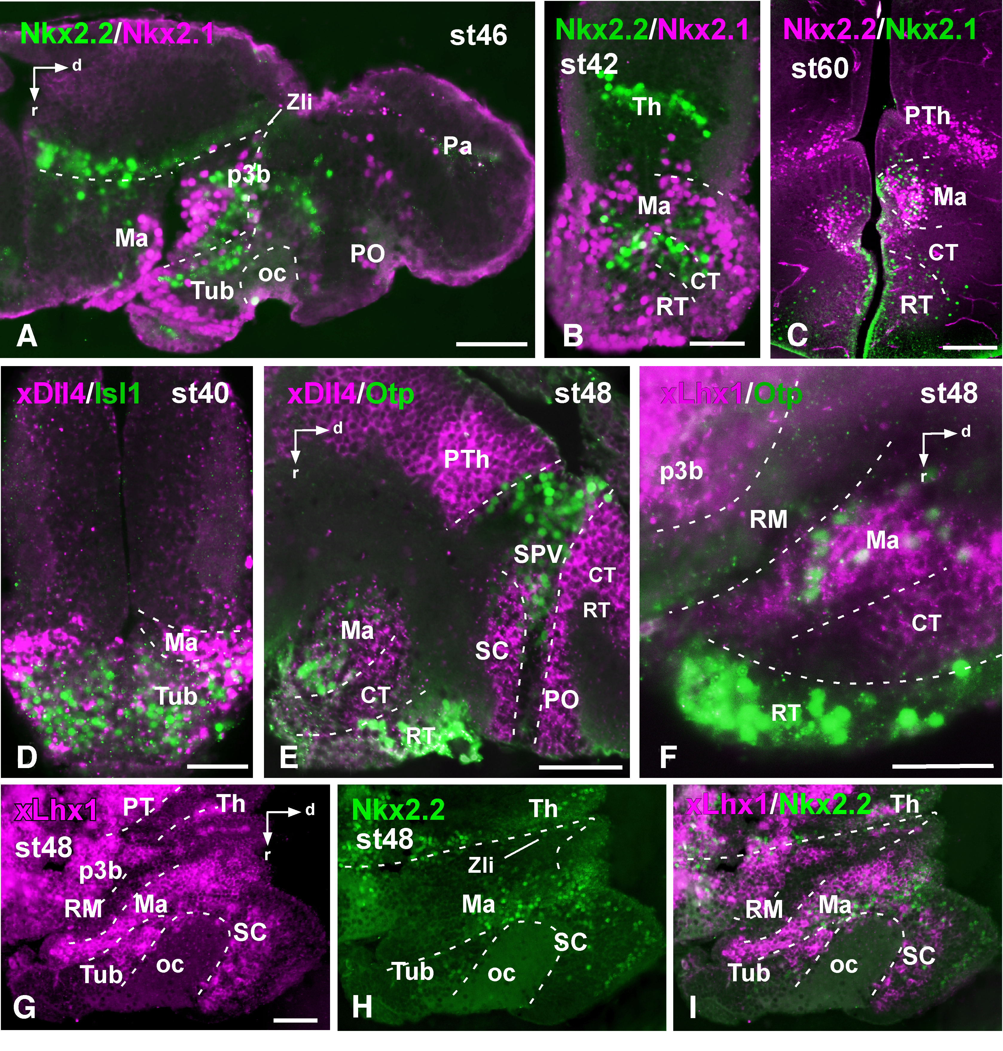 Figure 5. Photomicrographs of sagittal (A,E–I) and transverse (B–D) sections through the developing hypothalamus of Xenopus showing in the mammillary region and adjacent areas the combined expression of Nkx2.2 and Nkx2.1 (A–C), xDll4 and Isl1 (D), xDll4 and Otp (E), xLhx1 and Otp (F). Single expression for xLhx1 (G) and Nkx2.2 (H) are shown together with the merged image (I). Developmental stages are indicated in each photograph. A magenta-green version of this figure is provided as Supporting Information Fig. 4. Scale bars = 100 μm (in G is valid for H,I). |