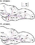 Figure 12. Schemes in sagittal view summarizing the main afferent and efferent connections of the tuberal and mammillary regions in Xenopus. |