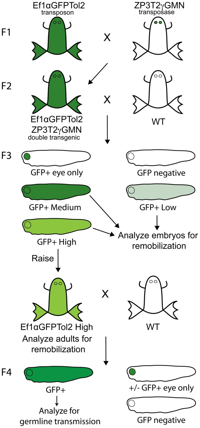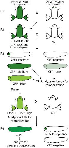 Figure 2. Mating scheme for generation and analysis of Ef1αGFPTol2 remobilized transposons.The diagram is a schematic of the crosses to test transposon mobilization in each of three different lines. We crossed three F1 heterozygous ZP3T2γMN transposase frogs (one from each injected tranposase animal U1946♂, U1984♀ and U1985♀) with three F1 homozygous Ef1αGFPTol2 frogs to generate three F2 double transgenic (Ef1αGFPTol2/ZP3T2γGMN) offspring clutches. Double transgenic animals from each clutch were outcrossed, and F3 ubiquitous GFP+ embryos of each phenotype observed were collected and tested for remobilization. High intensity F3 embryos, found only in the U1984♀ line, were raised to adulthood, tested for remobilization, and outcrossed to test for germline transmission.