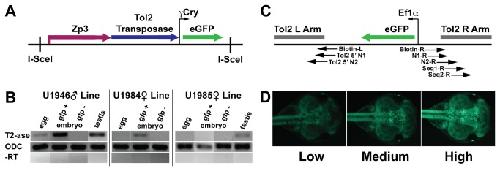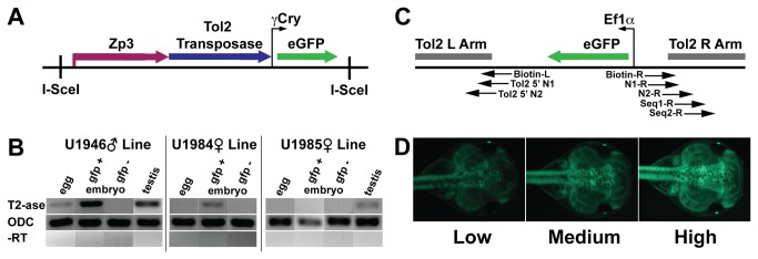 Figure 1. Transgenic lines.A. Diagram of ZP3T2γGMN construct used to produce transgenic frogs expressing Tol2 transposase. Not to scale. I-SceI: Meganuclease site necessary for transgenesis. Zebrafish zona pellucida glycoprotein 3 (zp3) promoter: drives egg specific expression of Tol2 transposase. Gamma crystallin promoter (γCry): drives expression of eGFP in lens of the eye as a reporter for transgene insertion. B. RT-PCR for transposase expression in transgenic ZP3T2γGMN F1 offspring arising from outcrosses of transposase transgene injected animals U1946â, U1984â and U1985â. Pools of 10 egg, stage 30 gfp+ and gfp- embryos were tested. In the U1946â and U1985â lines, one testis from adult male frogs was also tested. OCD primers were used as positive controls (- RT). reactions using GFP+ embryos, and water (data not shown) were also used as negative controls. C. Diagram of Ef1αGFPTol2 construct. Tol2 left (L) and right (R) arms, EF1α enhancer driving eGFP transgene. Arrows: indicate specified LM-PCR and sequencing primer binding sites on transposon arms. D. Ubiquitous GFP+ phenotypes. Low, Medium, and High Intensity phenotypes were seen in F3 and F4 embryos.