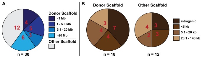 Figure 3. Remobilization Data.A. Number of remobilizations mapped to donor scaffold 8 compared to those mapped to other scaffolds. Proximity (Mb) of remobilized transposons on scaffold 8 to the donor locus is also shown. B. Number of intragenic versus intergenic integrations for remobilizations on both donor and other scaffolds, including proximity (kb) of intergenic integrations to the nearest flanking gene. The size of the pie charts indicates the relative number of remobilizations on donor versus other scaffolds. Number of samples in each category are shown within the pie slices for both A and B, and total n numbers are indicated beneath each graph.