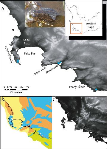 Figure 1. Xenopus gilli sites in the southwest of South Africa.(A) Sampling sites for the present study, squares indicate where Xenopus gilli was sampled for this study. A triangle denotes an introduced population (Measey & de Villiers, 2011), and the white filled circle the presumed type locality: Silvermine River. Note that the squares are distributed in three disjunct areas at the end of the Cape Peninsula near the towns of Kleinmond and Pearly Beach. (B) Vegetation types (after Mucina & Rutherford, 2006) and their projection onto the exposed Agulhas bank after a 120 m reduction in sea level (current coastline is shown as a black line) following Compton (2011). Note that current and historical sites for X. gilli (circles) are associated with lowland Sand-stone fynbos (blue) and not with Sand fynbos (yellow), Renosterveld (brown) or Strandveld (green). (C) Relief map of the same southwestern Cape region after a 25 m increase in sea level. Note that the Cape peninsula becomes two islands separated from the mainland by inundation of the Cape Flats. X. gilli sites in Betty’s Bay and Kleinmond are separated from those at Pearly Beach by high ground and a salt-water estuary.