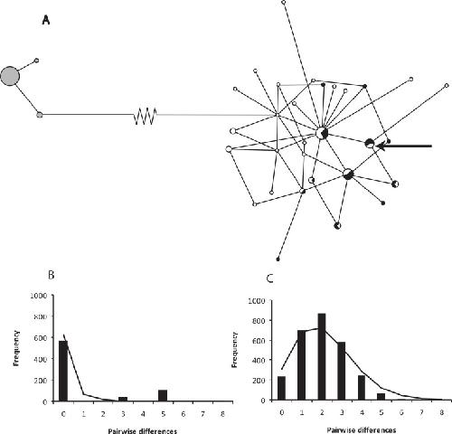 Figure 2. A network of ND2 haplotypes for Xenopus gilli populations.(A) Median-joining network diagrams of the number and structure of X. gilli haplotypes in the Cape peninsula and eastern populations based on ND2. Cape peninsula animals are indicated in grey, Pearly Beach indicated in white and Kleinmond in black. Circles are proportional to the number of individuals sequenced belonging to each haplotype and lines represent the number of nucleotide base pair changes from one to the other. Note that the 74 base pair changes between the two haplotype groups are represented by a broken line. The arrow points at a haplotype not included in the analysis but found on the Cape peninsula. (B) Pairwise difference and frequency for ND2 haplotypes for Xenopus gilli from the Cape peninsula, and (C) Pearly Beach and Kleinmond.
