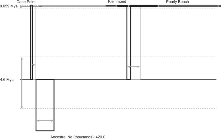 Figure 3. IMa2 coalescent analysis of Xenopus gilli.Result of the coalescent analysis (in IMa2) provides histories for the three disjunct areas sampled which are represented as boxes (for sampled and ancestral populations), horizontal lines (for splitting times). The size of the boxes on the horizontal axis is proportional to estimated current and ancestral population sizes. Time is represented on the vertical axis, with the sampled sites at the top representing the sampling time. Estimated error is shown in grey (boxes and arrows).