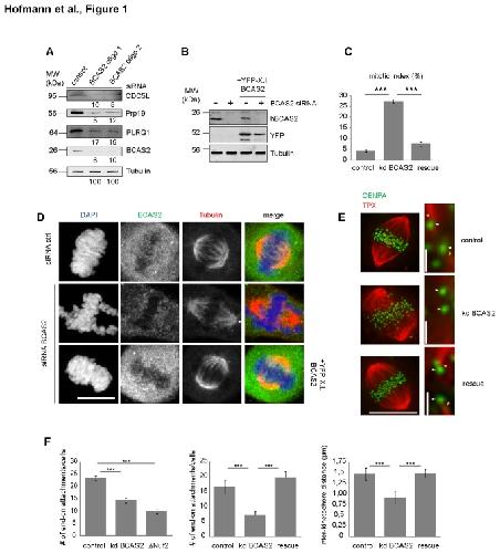 Figure 1. Knockdown of Prp19 complex components in human cells compromises mitosis.(A): HeLa cell lysates analyzed by immunoblotting with Prp19 complex antibodies, after knockdown of BCAS2 by siRNA (1 and 2). Numbers indicate protein levels relative to Tubulin. (B-E) BCAS2 (oligo 1) knockdown (siRNA BCAS2, kd BCAS2) and control (siRNA ctrl). YFP-Xenopus laevis (X.l.) BCAS2 was expressed to complement knockdown of the human (h.s.) BCAS2 (B): Immunoblot to show knockdown of endogenous human BCAS2 and re-expression of the