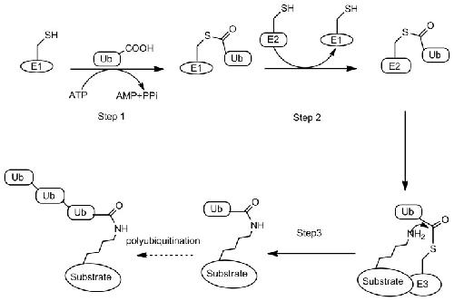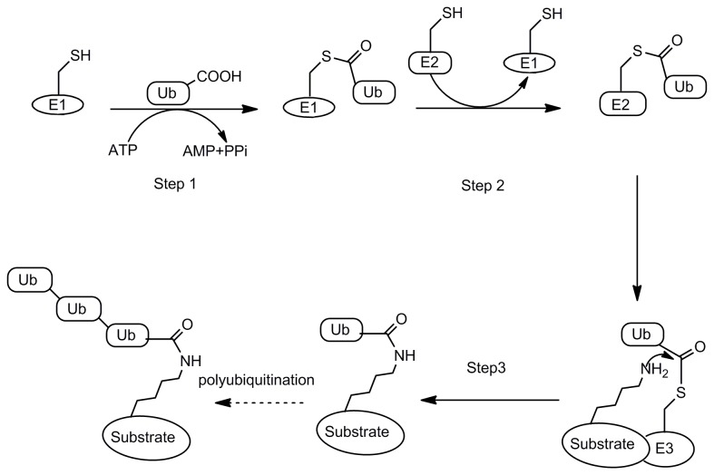 Figure 1. Ubiquitination of a protein substrate through E1→E2→E3.Step1: E1 activates Ub C terminus to form a thioester intermediate by coupling ATP hydrolysis; Step2: the activated Ub is transferred to E2 also in the thioester form; Steps3: the E3 ligase catalyzes the transfer of one Ub molecule at a time or a Ub chain to a protein target.