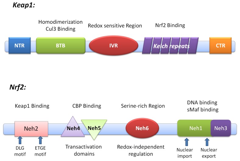 Figure 2. Domain structure of Nrf2 and Keap1.Keap1 possesses four characteristic domains: the Broad complex, Tramtrack, and Bric-a-Brac (BTB); the intervening region (IVR); the double glycine repeat or Kelch repeat (DGR); and the C-terminal region (CTR). The DGR and CTR domains, also known as DC domain, mediate interaction with Neh2 domain of Nrf2. Nrf2 can be divided into six highly homologous regions (Neh1 to Neh6 domains) through comparing the human and chicken Nrf2 amino acid sequences. Neh2 is responsible for interacting with Keap1.