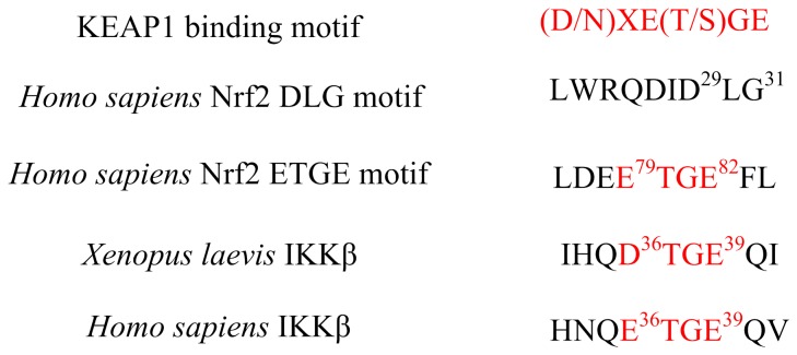 Figure 3. Sequence comparison of Keap1 binding motif.The Asn34 and Gln35 are located before ETGE in human IKKβ, while these two residues change to the Asp77 and Glu78 in Nrf2.