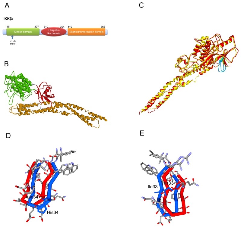 Figure 4. Homology Modeling of Homo sapiens IKKβ.(A) Domain structure of IKKβ. IKKβ can be divided into three function domains: a kinase domain (KD), an ubiquitin-like domain (ULD) and an elongated, α-helical scaffold/dimerization domain (SDD) colored as green, red and yellow. (B) Ribbon diagram of Homo sapiens IKKβ from Homology Modeling. KD (green), ULD (red) and SDD (yellow) are labeled. (C) Superimpose of Homo sapiens IKKβ and Xenopus laevis IKKβ. The Keap1 binding motif is colored as azure. In general, the structure of Homo sapiens IKKβ (yellow) and Xenopus laevis IKKβ (red) are quite similar. Both of the Keap1 binding motifs (blue) form the β-turn structure. (D) & (E) Structure difference of Keap1 binding motif between Homo sapiens IKKβ (red) and Xenopus laevis IKKβ (blue). The most different residues were labeled in the picture.