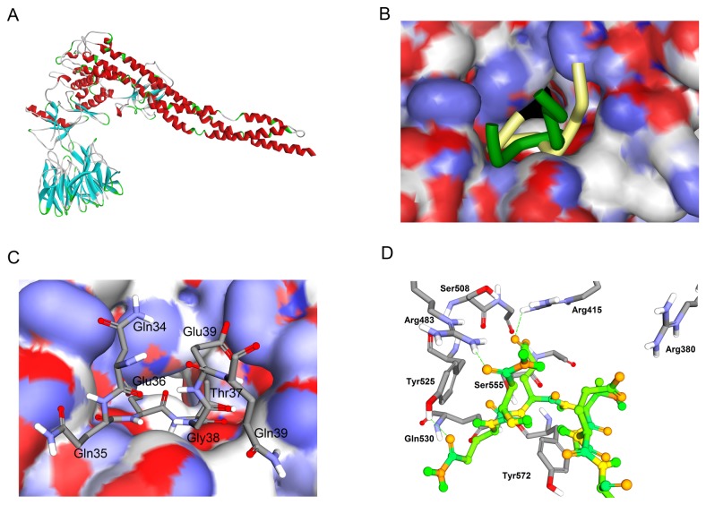 Figure 5. Protein-Protein Docking of IKKβ and Keap1.(A) Complex of IKKβ and Keap1 shown as ribbon diagram. The Keap1 binding motif of IKKβ fits into an identical pocket of Keap1. (B) Superimpose of IKKβ (Dark green) and Nrf2 (yellow, PDB ID: 2FLU) ETGE motif in the Keap1 cavity. IKKβ and Nrf2 occupy almost the same part of Keap1 cavity. However, the structures of ETGE motif show some differences. In the case of IKKβ, the two antiparallel β-strands, forming the turn region, are closer than the Nrf2 ETGE motif. (C) The top view of Keap1-IKKβ complex. The IKKβ ETGE motif is represented in sticks and the surface of Keap1 is colored by partial charge. Both of the two side chain carboxyl groups point to the positively charged surface. (D) Interacting amino acid residues on the IKKβ and Keap1. The interacting region of Keap1 is represented in sticks and the regions of IKKβ are shown in ball and sticks.