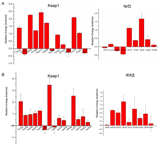 Figure 8. Virtual Alanine Mutation of binding residues.The Y axis is the weighted mutation energy (unit: kcal/mol) and the X axis is the name of mutated amino acid. (A) Mean values of Virtual Alanine Mutation of Nrf2-Keap1 complex with standard deviation. (B) Mean values of Virtual Alanine Mutation of Keap1-IKKβ complex obtained from triplicate MD simulations with standard deviation.