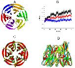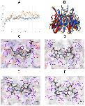 Figure 6. MD simulation of Keap1 DC domain.(A) The six kelch repeats that comprise the DGR domain of Keap1 form a highly symmetric, 6-bladed-propeller structure (Blade I: residue 598-609 and 327-358, blue; Blade II: residue 359-409, red; Blade III: residue 410-456, purple; Blade IV: residue 457-503, yellow; Blade V: 504-550, green; Blade VI: residue 551-597, orange PDB code: 2FLU). (B) Analysis of Root Mean Square Deviation of backbone atoms during molecular dynamics simulation (red for the first run, blue for the second run and black for the third run). (C) & (D) Representative structures of triplicate MD simulations (coloured as azure, yellow and green) superimposed to the starting structure (red). Though the whole structure of Keap1 DC domain is stable, all six blades of the β-propeller tend to be more open and loose.