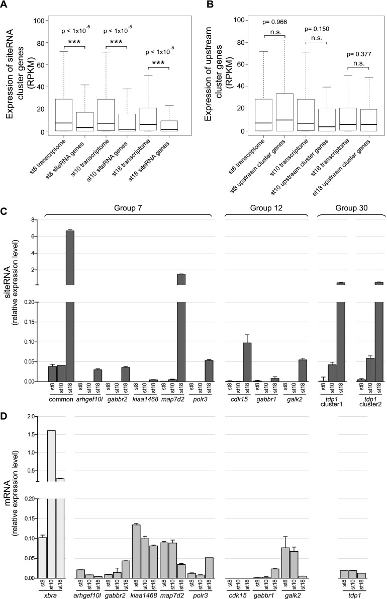 Small RNA control of gene expression is critical for developmental processes in vertebrate embryos. To determine the dynamics of small RNA expression and to uncover novel small RNAs in the early vertebrate embryo, we performed high-throughput sequencing of all small RNAs in Xenopus tropicalis embryos at three developmental time points and in dissected halves of gastrula embryos. This analysis allowed us to identify novel microRNAs and we show that microRNA expression is highly dynamic and spatially localized in early embryos. In addition, we have developed a microRNA prediction pipeline and demonstrate that it has the power to predict new miRNAs that are experimentally detectable in frogs, mice, and humans. By combining the small RNA sequencing with mRNA profiling at the different developmental stages, we identify a new class of small noncoding RNAs that we name siteRNAs, which align in clusters to introns of protein-coding genes. We show that siteRNAs are derived from remnants of transposable elements present in the introns. We find that genes containing clusters of siteRNAs are transcriptionally repressed as compared with all genes. Furthermore, we show that this is true for individual genes containing siteRNA clusters, and that these genes are enriched in specific repressive histone modifications. Our data thus suggest a new mechanism of siteRNA-mediated gene silencing in vertebrates, and provide an example of how mobile elements can affect gene regulation.