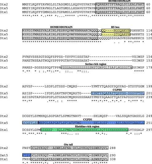 Fig. 1. Multi-alignment of Xenopus Otx1, Otx2 and Otx5. Multi-alignment of Otx sequences has been obtained using ClustaW. âââ: identical residue; â:â: conserved substitution; â.â: semi-conserved substitution. Homeodomain: shaded dark grey box; Otx tail: shaded light grey box; Otx2 and Otx5 retinal specificity boxes (RS box): shaded yellow boxes; Otx1 Ser-rich region: open box; Otx1 His-rich region: light green box; cement gland promoting domain D2 (CGPD2): shaded light blue box; cement gland promoting domain D1 (CGPD1): shaded blue box.