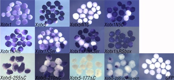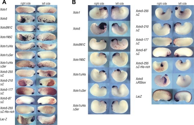 Fig. 3. Results of embryos microinjections and ag1 in situ hybridization. (A and B) A total amount of 800 pg of capped mRNAs corresponding to the different constructs as shown was ventrally (A) or dorsally (B) bilaterally microinjected in Xenopus embryos at 4-cell stage; embryos were grown to tailbud stage and processed by whole mount in situ hybridization with an ag1 probe. When microinjected dorsally (B), otx1, otx2 and otx5 induce posterior defects in Xenopus embryos; this activity is maintained by all constructs, but Xotx5-87δC. LacZ was coinjected as a tracer. Microinjection of LacZ alone was used as negative control.