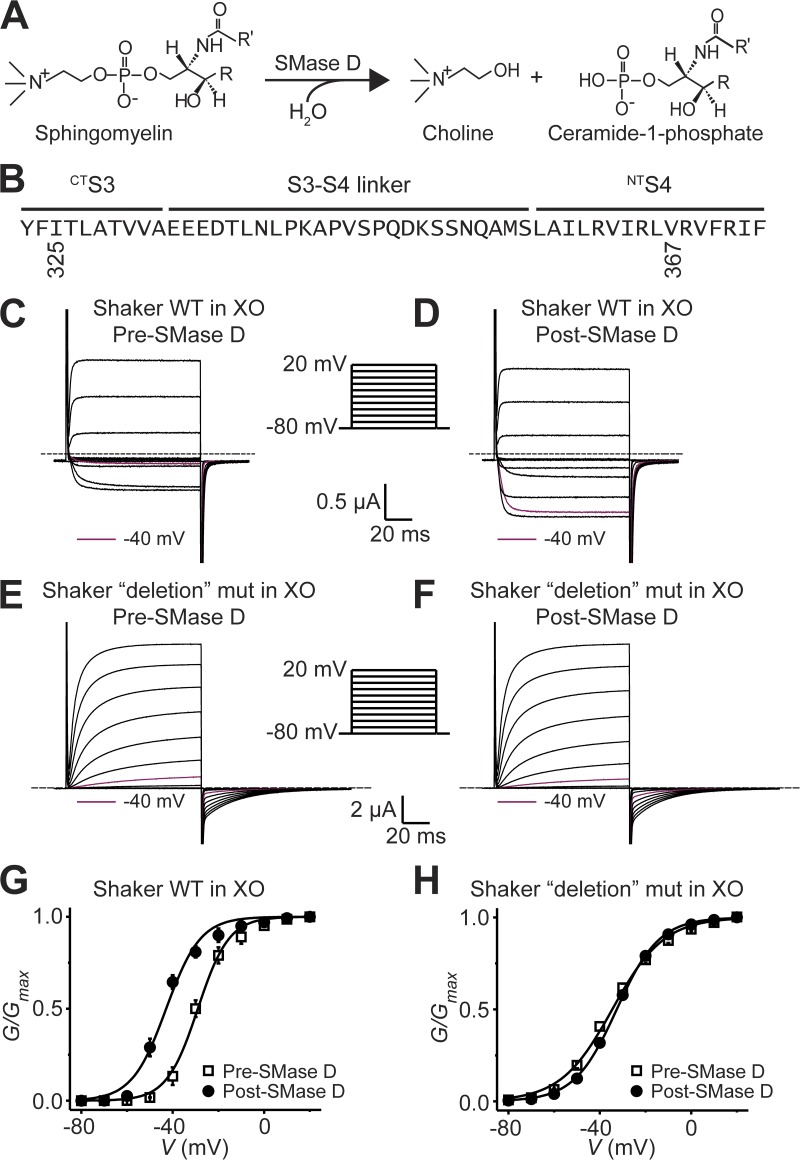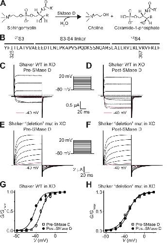 Figure 1. The extracellular portion of Shaker’s paddle motif is required for SMase D sensitivity. (A) Hydrolysis scheme of sphingomyelin by SMase D. (B) Amino acid sequence of Shaker’s paddle motif. Residues from I325 through V367 were replaced with a glycine triplet in the “deletion” mutant (mut) in E, F, and H. (C–F) Wild-type currents in 100 mM of extracellular K+ ([K+]ext; C and D) and “deletion” mut currents in 20 mM [K]ext (E and F) elicited by stepping membrane voltage of Xenopus oocytes (XO) from the −80-mV holding voltage to between −80 and 20 mV in 10-mV increments at 3-s intervals before (“pre”; C and E) and after (“post”; D and F) SMase D treatment, where for comparison, the current traces at −40 mV are colored maroon. Dashed lines indicate zero current levels. (G and H) G-V curves before (open squares) and after (closed circles) SMase D treatment for wild-type (G) and “deletion” mut (H), where all data are presented as means ± SEM (n = 5). The curves are fits of Boltzmann functions, yielding the midpoint (V1/2) of −29.0 ± 0.6 mV and the apparent valence (Z) of 3.8 ± 0.3 (open squares) or V1/2 = −42.9 ± 0.9 mV and Z = 3.4 ± 0.3 (closed circles) for G, and V1/2 = −34.6 ± 0.5 mV and Z = 2.3 ± 0.1 (open squares) or V1/2 = −32.6 ± 0.2 mV and Z = 2.7 ± 0.1 (closed circles) for H. |