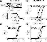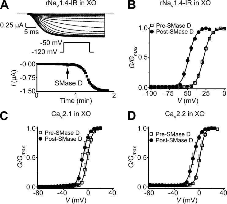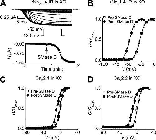 Figure 4. SMase D shifts the G-V curves of NaV and CaV channels expressed in Xenopus oocytes in the hyperpolarized direction. (A) NaV1.4-IR currents elicited by stepping the voltage every 4 s from the −100-mV holding potential to a −120-mV prepulse, and then to the −50-mV test potential; the dashed line indicates the zero current level. After the addition of recombinant SMase D to the bathing solution, the current gradually increased (top). Time course of NaV1.4-IR current increase after the addition of SMase D (bottom). (B–D) G-V curves before (squares) and after (circles) treatment with SMase D for NaV1.4-IR (B), CaV2.1 (C), and CaV2.2 (D), where all data are presented as means ± SEM (n = 3–9). The curves are fits of Boltzmann functions, yielding the midpoint (V1/2) of −28.2 ± 0.4 mV and the apparent valence (Z) of 5.2 ± 0.1 (open squares), or V1/2 = −48.5 ± 0.2 mV and Z = 5.2 ± 0.2 (closed circles) for B; V1/2 = −1.0 ± 0.1 mV and Z = 6.3 ± 0.2 (open squares), or V1/2 = −8.4 ± 0.2 mV and Z = 5.6 ± 0.3 (closed circles) for C; V1/2 = 1.5 ± 0.1 mV and Z = 6.6 ± 0.2 (open squares), or V1/2 = −8.9 ± 0.2 mV and Z = 5.1 ± 0.2 (closed circles) for D. |