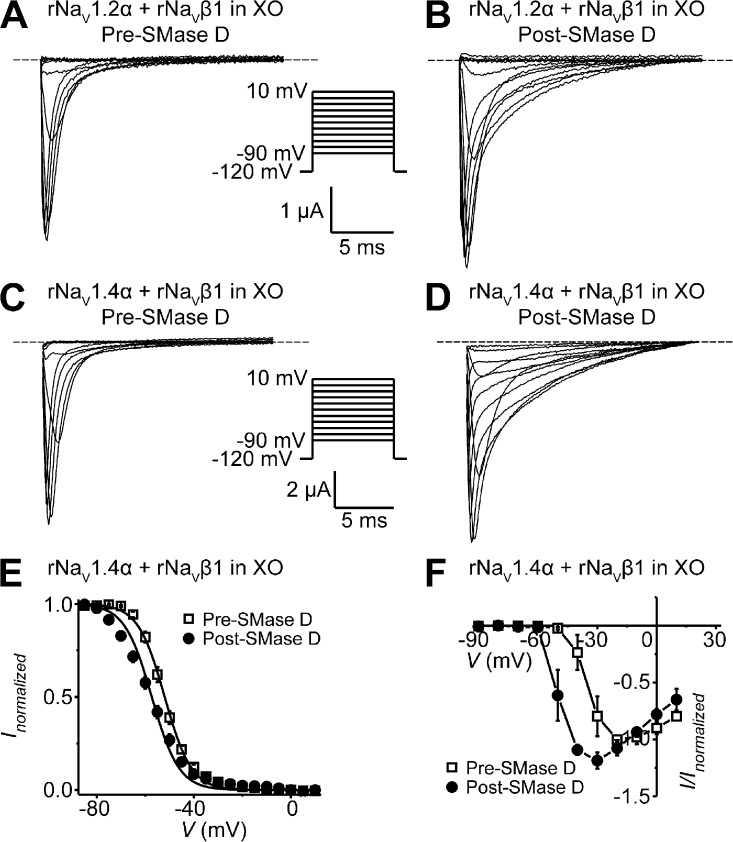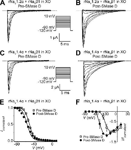 Figure 5. SMase D stimulates NaVα + β1 channels in oocytes and slows their inactivation. (A–D) rNav1.2α + β1 (A and B) or rNav1.4α + β1 (C and D) currents from an oocyte, before (A and C) and after (B and D) SMase D treatment, by stepping the membrane voltage from the −120-mV holding voltage to various test potentials between −90 and 10 mV. (E and F) Steady-state inactivation curves (E) and I-V relations (F) before (open squares) and after (closed circles) SMase D treatment; all data are presented as means ± SEM (n = 3–6). Curves in E are fits to single Boltzmann functions, yielding V1/2 = −52.0 ± 0.2 mV and Z = 4.7 ± 0.2 (open squares), and V1/2 = −56.1 ± 0.8 mV and Z = 3.6 ± 0.2 (closed circles). |